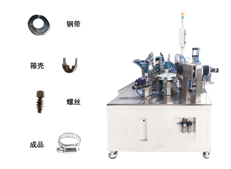 Thiết bị này được sử dụng để sản xuất tự động vòng kẹp cổ nhỏ kiểu Mỹ, vỏ vòng được cấp liệu tự động bằng đĩa rung, được robot chuyển đến khuôn xoay. Vít được cấp liệu tự động bằng đĩa rung và được robot đưa vào trong vỏ vòng. Dây thép được cấp liệu chính xác bằng động cơ servo, chiều dài có thể được thiết lập. Cắt, định hình bằng khuôn, và được robot đưa lên vỏ vòng để đột dập, sau đó hoàn thành lần lượt các công đoạn cuốn tròn, khóa dây và xuất liệu thành phẩm. Thiết bị sử dụng màn hình cảm ứng PLC, thao tác đơn giản, dễ học. Hiệu suất hoạt động cao, độ ổn định tốt, được đánh giá cao trong ngành.